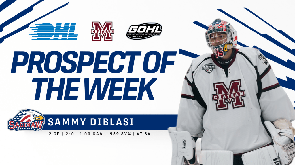 Saginaw Spirit prospect Sammy DiBlasi of the Chatham Maroons is the GOHL Prospect of the Week, going 2-0 with a 1.00 goals-against average and .959 save percentage.