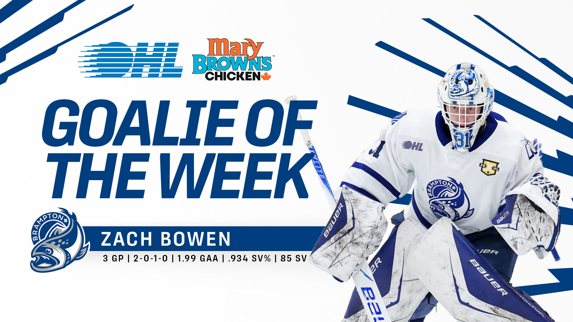 Zach Bowen of the Brampton Steelheads is the Mary Brown’s Chicken OHL Goaltender of the Week for the second time this season, helping the Steelheads secure five of a possible six points with a 1.99 goals-against average and .934 save percentage while turning aside 85 shots.