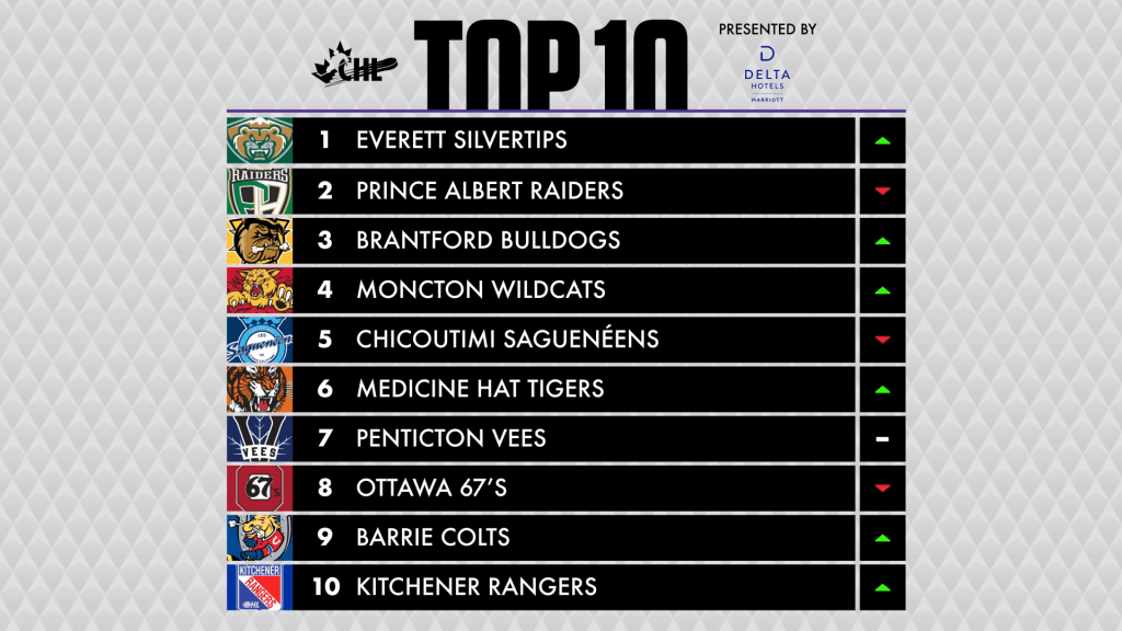CHL Top-10 Rankings – Week 19 1. Everett Silvertips (WHL) 2. Prince Albert Raiders (WHL) 3. Brantford Bulldogs (OHL) 4. Moncton Wildcats (QMJHL) 5. Chicoutimi Saguenéens (QMJHL) 6. Medicine Hat Tigers (WHL) 7. Penticton Vees (WHL) 8. Ottawa 67’s (OHL) 9. Barrie Colts (OHL) 10. Kitchener Rangers (OHL)