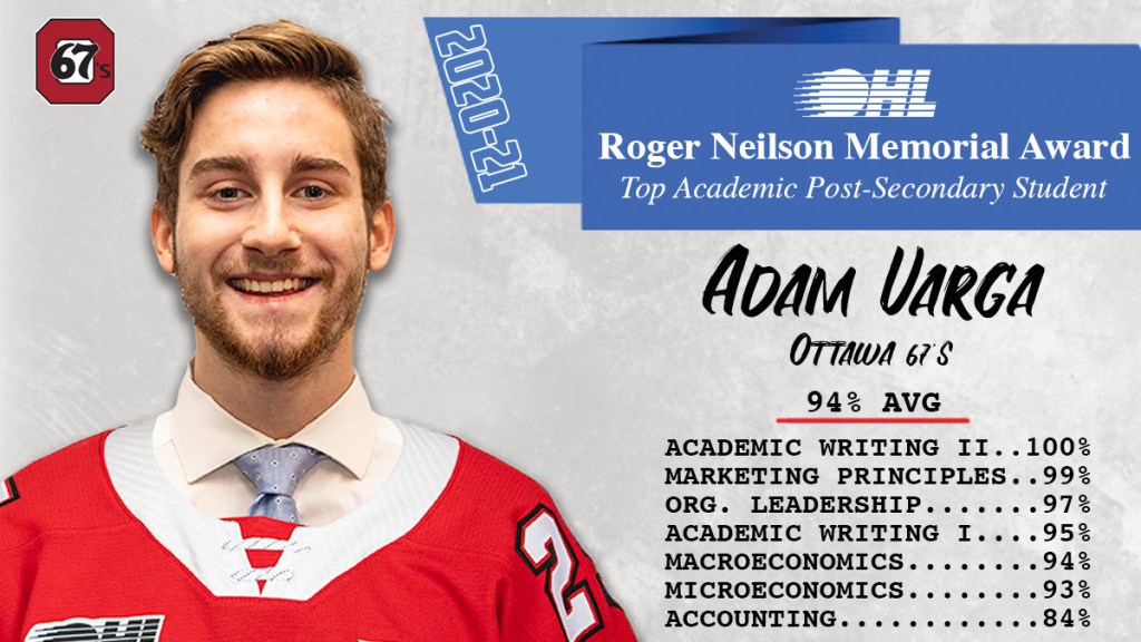 Toronto, Ont. – The Ontario Hockey League is pleased to announce that Ottawa 67’s forward Adam Varga is the 2020-21 recipient of the Roger Neilson Memorial Award presented annually to the League’s Top Academic Post-Secondary Student.