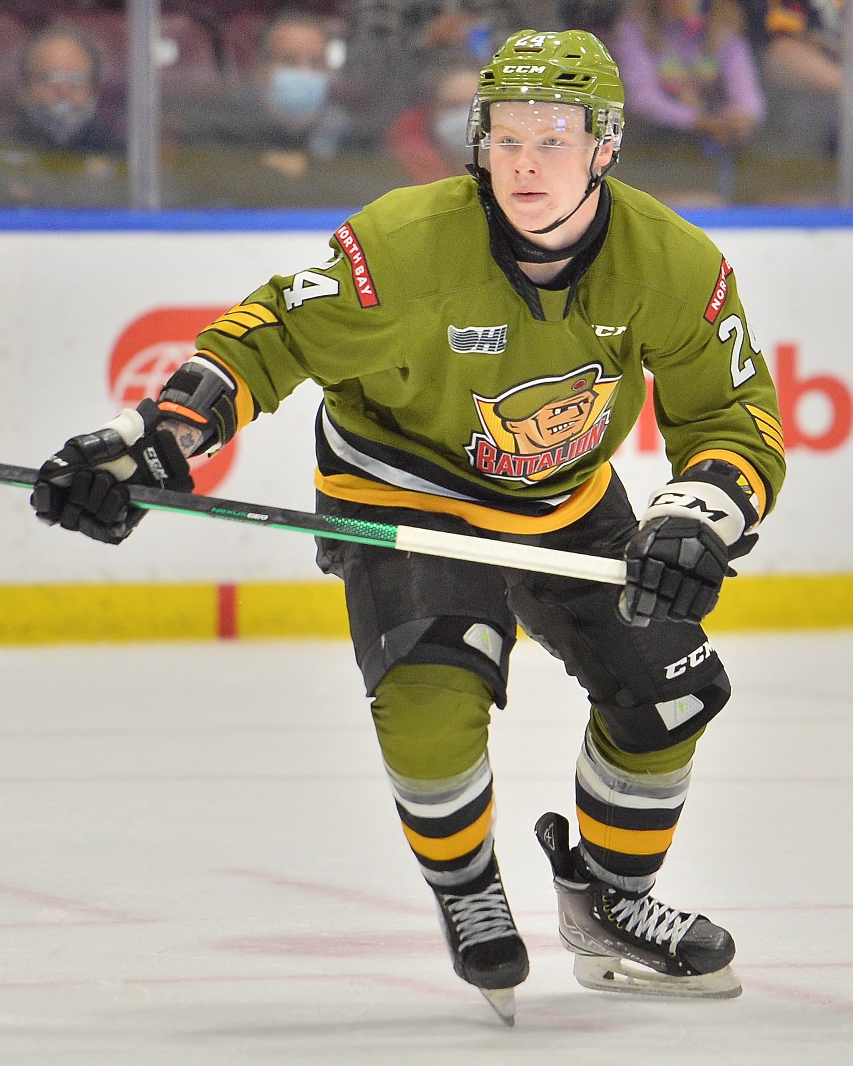 Drafted with the first overall pick at the 2020 OHL Priority Selection, 5’10, 197 pounder North Bay Battalion defenceman Ty Nelson has impressed through the first 25 games of the season. The rookie blueliner has 5 goals and 16 assists and is tied for the OHL rookie scoring lead. His 21 points place him fourth among all OHL defencemen.