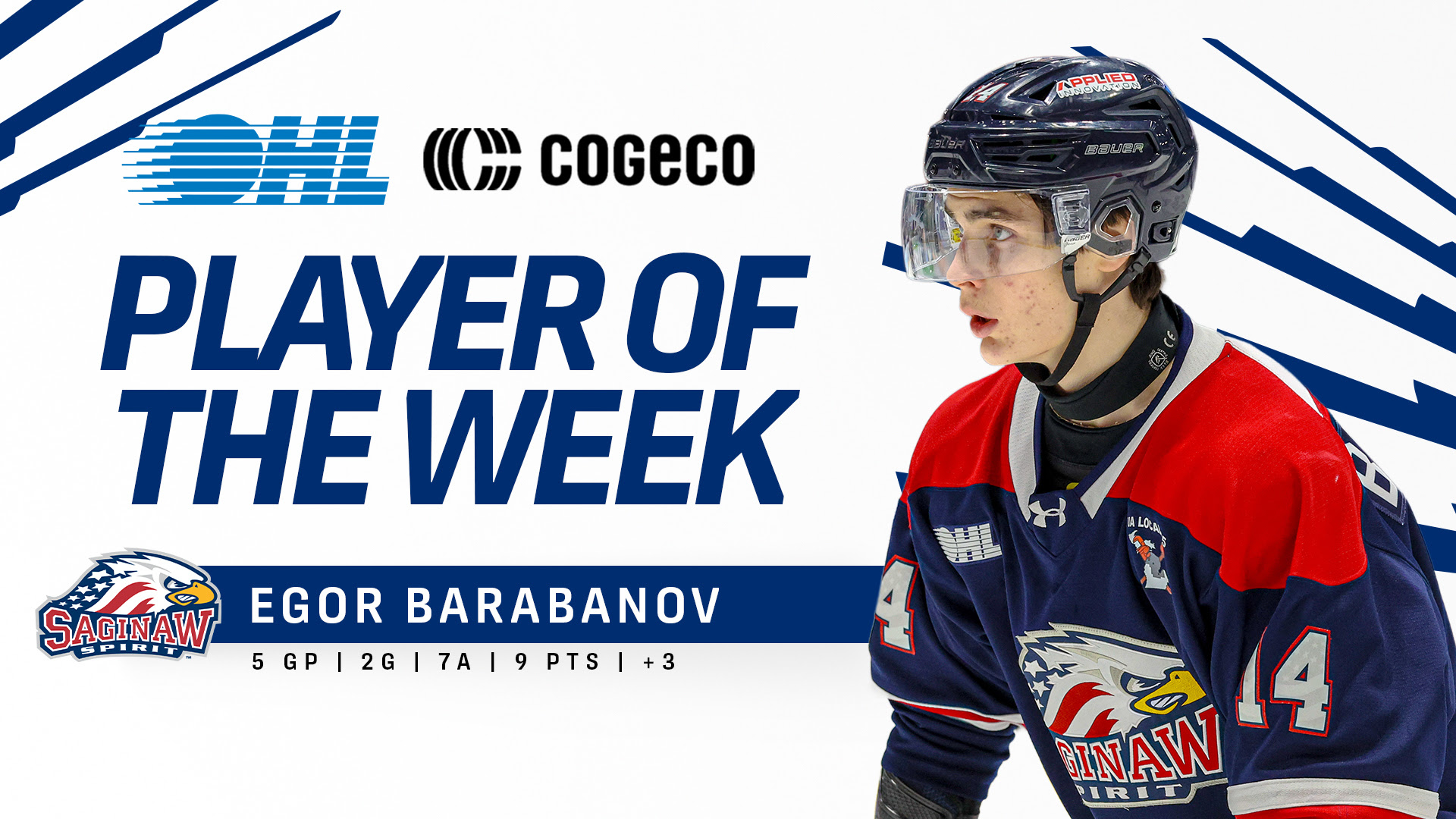 Saginaw Spirit forward Egor Barabanov is the Cogeco OHL Player of the Week, recording two goals, seven assists and nine points over five games dating back to Dec. 28th.