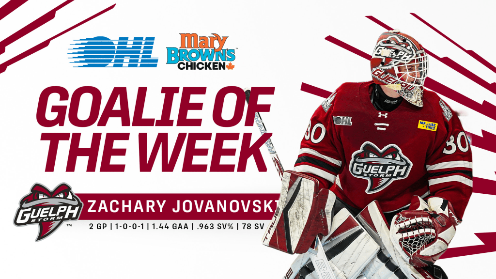 Zachary Jovanovski of the Guelph Storm is the Mary Brown’s Chicken OHL Goaltender of the Week, going 1-0-0-1 with a 1.44 goals-against average and .963 save percentage.