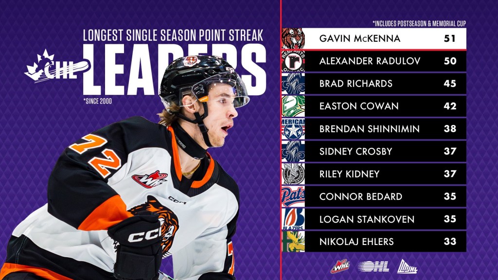MEDICINE HAT, AB — By tallying five assists during Game 2 of the WHL’s Eastern Conference Championship on Saturday night, Medicine Hat Tigers forwardGavin McKenna has registered a point in 51 consecutive games dating back to November 6, 2024, making it the Canadian Hockey League’s (CHL) longest point streak of the 21st century (postseason and Memorial Cup included).