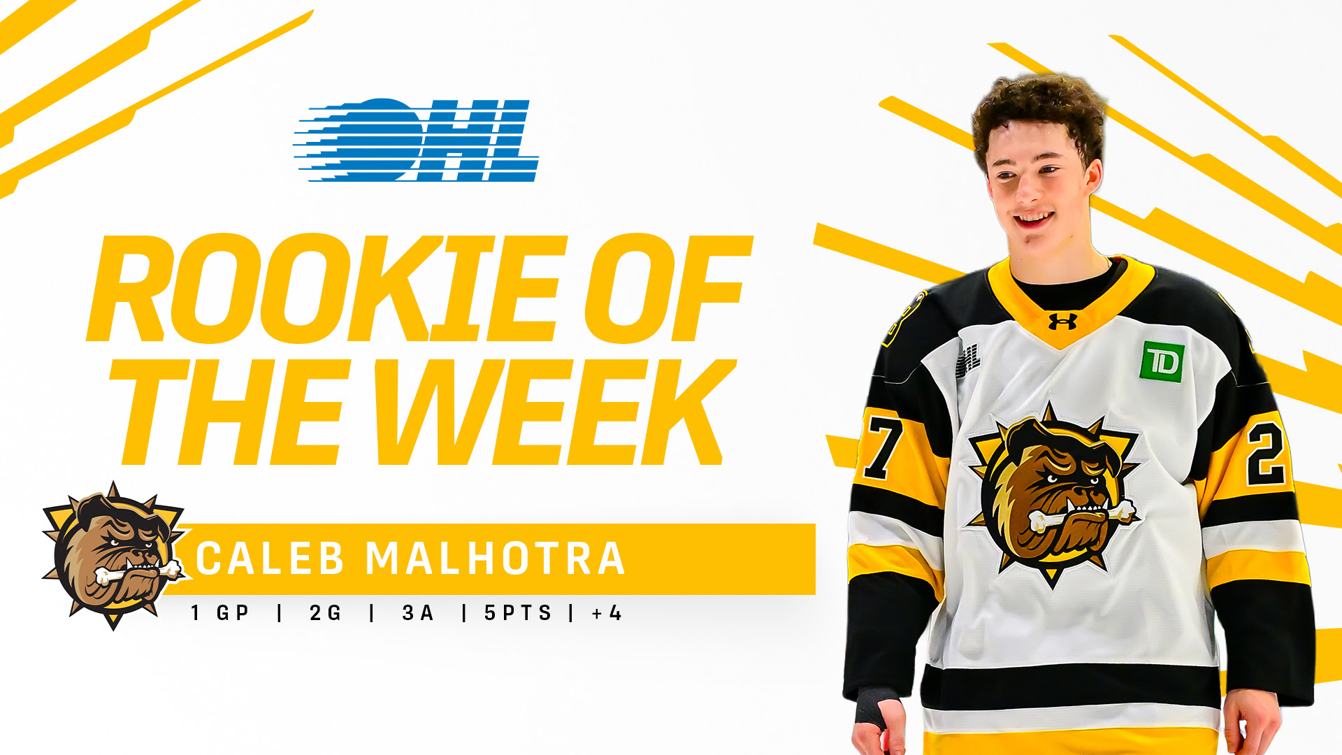 NHL Draft eligible forward Caleb Malhotra of the Brantford Bulldogs is the OHL Rookie of the Week for the third time this season, recording a goal and four assists in a pair of victories.