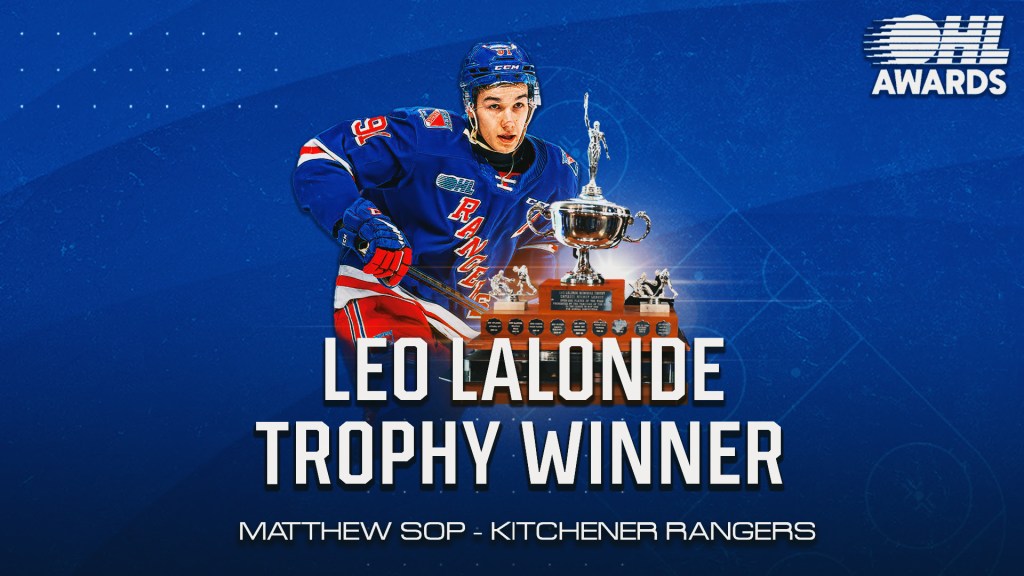 Toronto, Ont. – The Ontario Hockey League today announced that Kitchener Rangers forward Matthew Sop is the 2023-24 recipient of the Leo Lalonde Memorial Trophy awarded to the League’s Overage Player of the Year as voted by OHL General Managers.